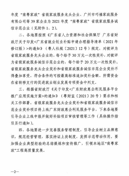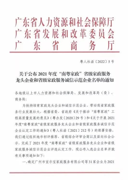 為扶持培育家政龍頭企業(yè)和誠信示范企業(yè),帶動我省家政服務(wù)行業(yè)發(fā)展壯大,根據(jù)省人社廳、省發(fā)改委、省商務(wù)廳《關(guān)于開展2021年度“南粵家政”省級家政服務(wù)龍頭企業(yè)和省級家政服務(wù)誠信示范企業(yè)認定工作的通知》(粵人社函〔2021〕212號)的部署安排,我們通過組織地市初評推薦、省級綜合評審以及面向社會公示,完成了2021年度“南粵家政”省級家政服務(wù)龍頭企業(yè)和省級家政服務(wù)誠信示范企業(yè)評選認定工作。中山市網(wǎng)政軟件有限公司被評為2021年度“南粵家政”省級家政服務(wù)龍頭企業(yè)!